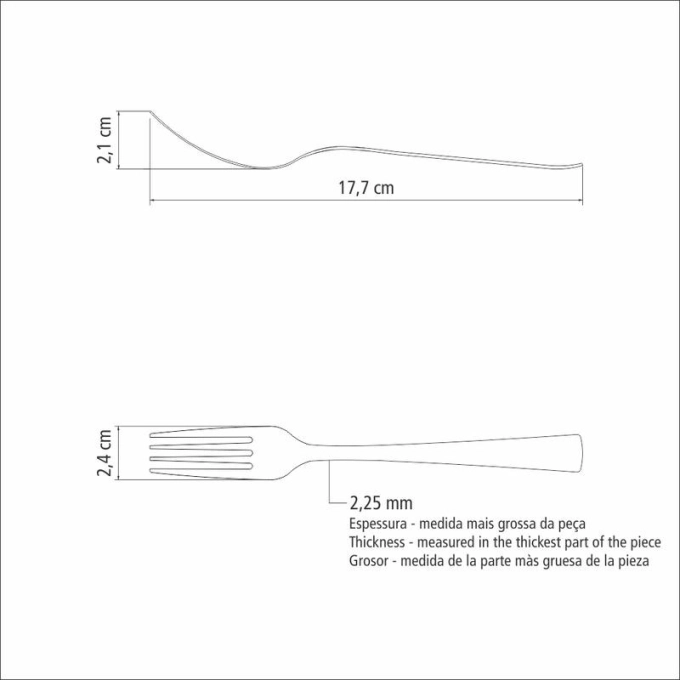 - Garfo com dentes polidos na parte interna, para proporcionar maior conforto no uso, com formato apropriado para a boca e bordas arredondadas.