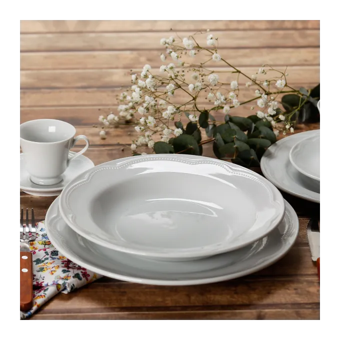 Sirva todo tipo de refeição para seus convidados com muita sofisticação com uma porcelana branca de alta qualidade e detalhes nos pratos que encantam e são de fácil limpeza.